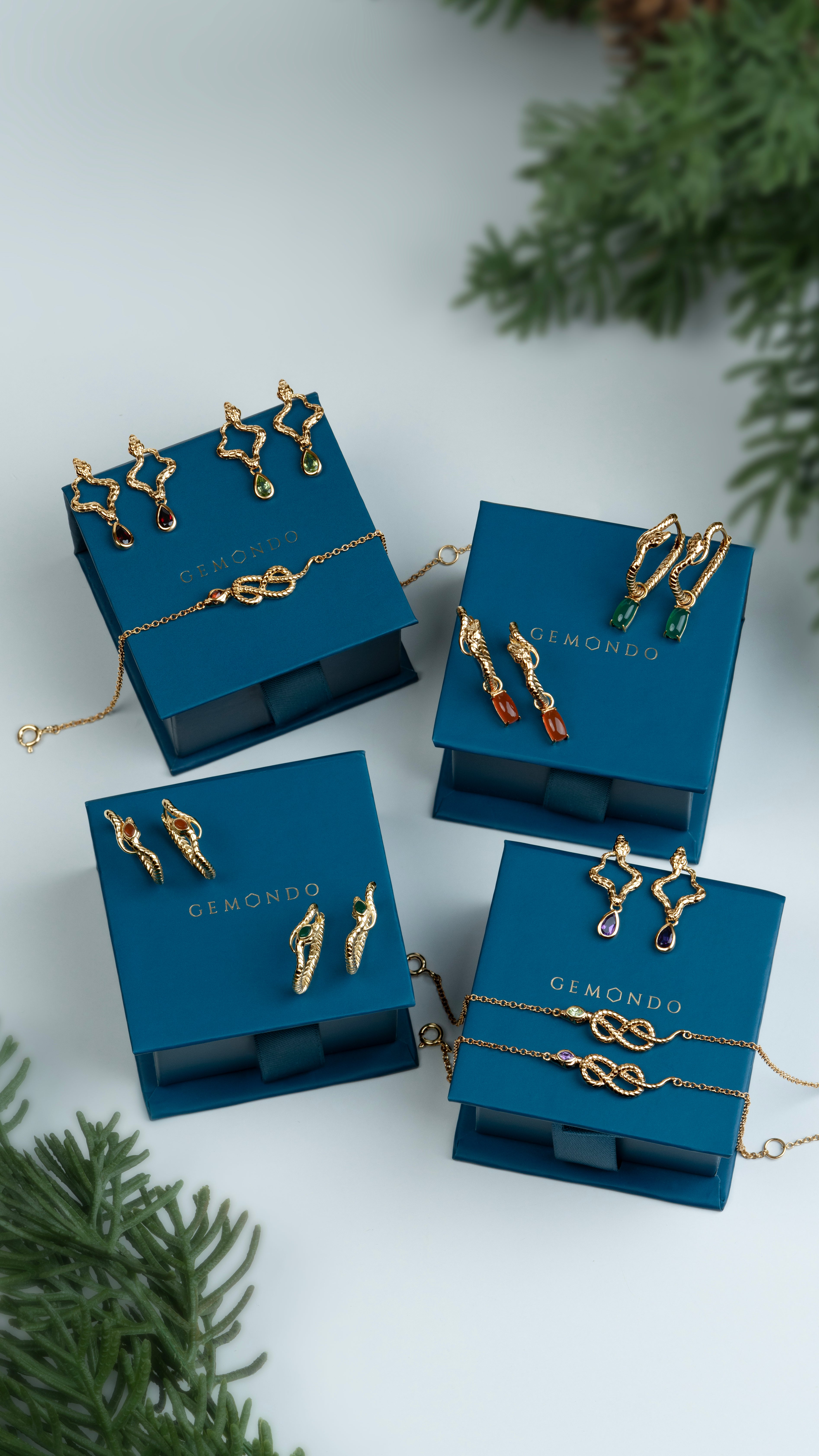 Blue gift box with a bow and 'GEMONDO' branding, held by a hand wearing a red ring. Hand with a red ring holding a blue gift box with a bow, featuring the brand 'GEMONDO'.