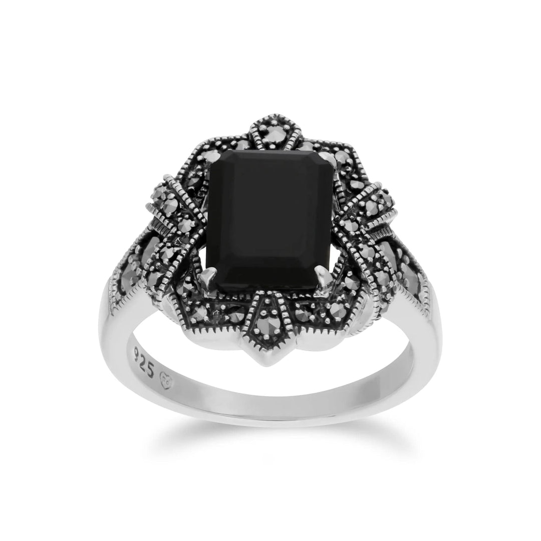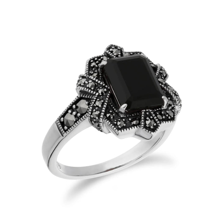 An eye catching marcasite ring crafted from sterling silver, featuring an octagon shaped black onyx gemstone surrounded by marcasite gemstones.