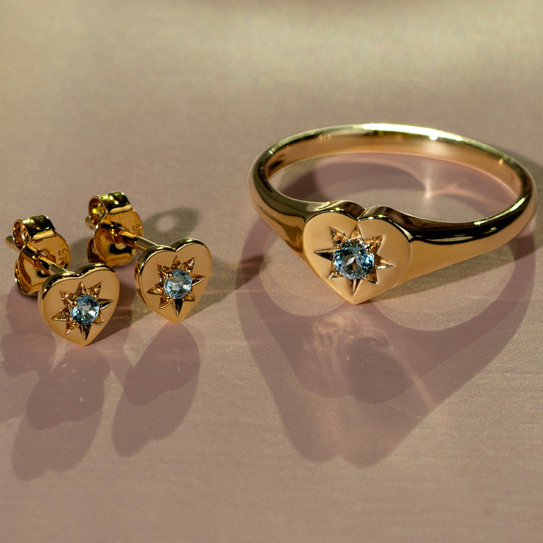 This ring features a central Amethyst on a four-pronged head with starburst detailing encased within a 9ct yellow gold heart. The gold band stretches to accentuate the heart design. Gift this ring to that special someone to make a wonderful expression of your love.
