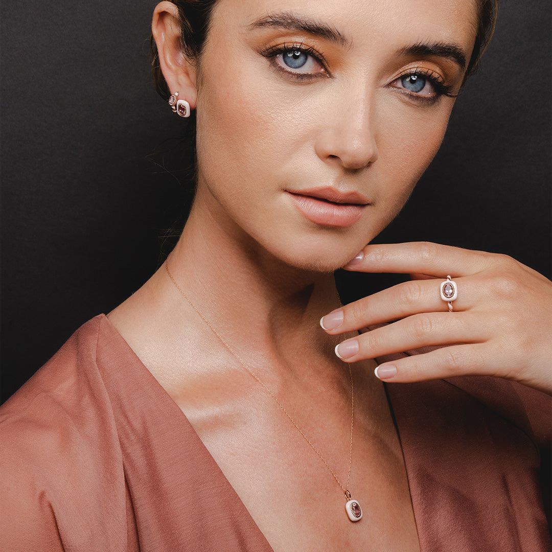 The sweet and stunning enamel ring with oval cuts in pink amethyst faceted come in rose gold plated Sterling silver.