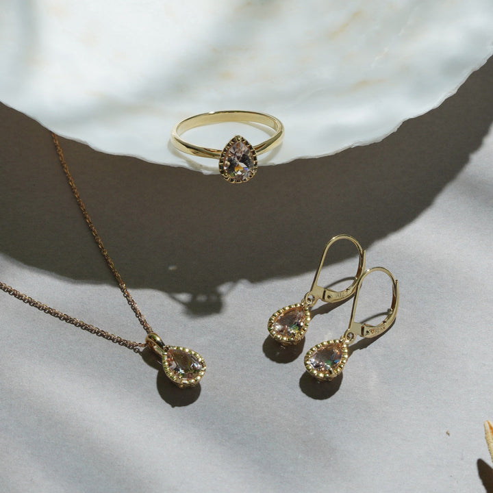 Also known as the teardrop, pear-cut gemstones blend the best of round and conical to create an elegant shape that tapers to a point. This charming cut is available in a range of precious and semi-precious stones.