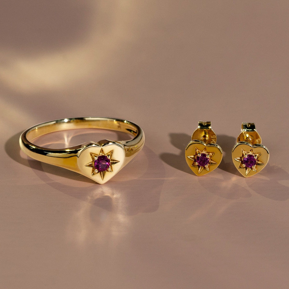 ECFEW™ 'The Liberator' Amethyst Heart Stud Earrings in 9ct Yellow Gold