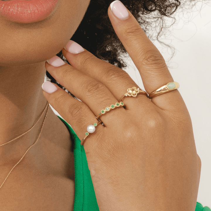 This beautiful ring features a central oval Freshwater Pearl encased by two sparkling Emeralds on a 9ct yellow gold band. Wear it alone or with other Gemondo rings to add the gemstone of the deep to your ring stack.