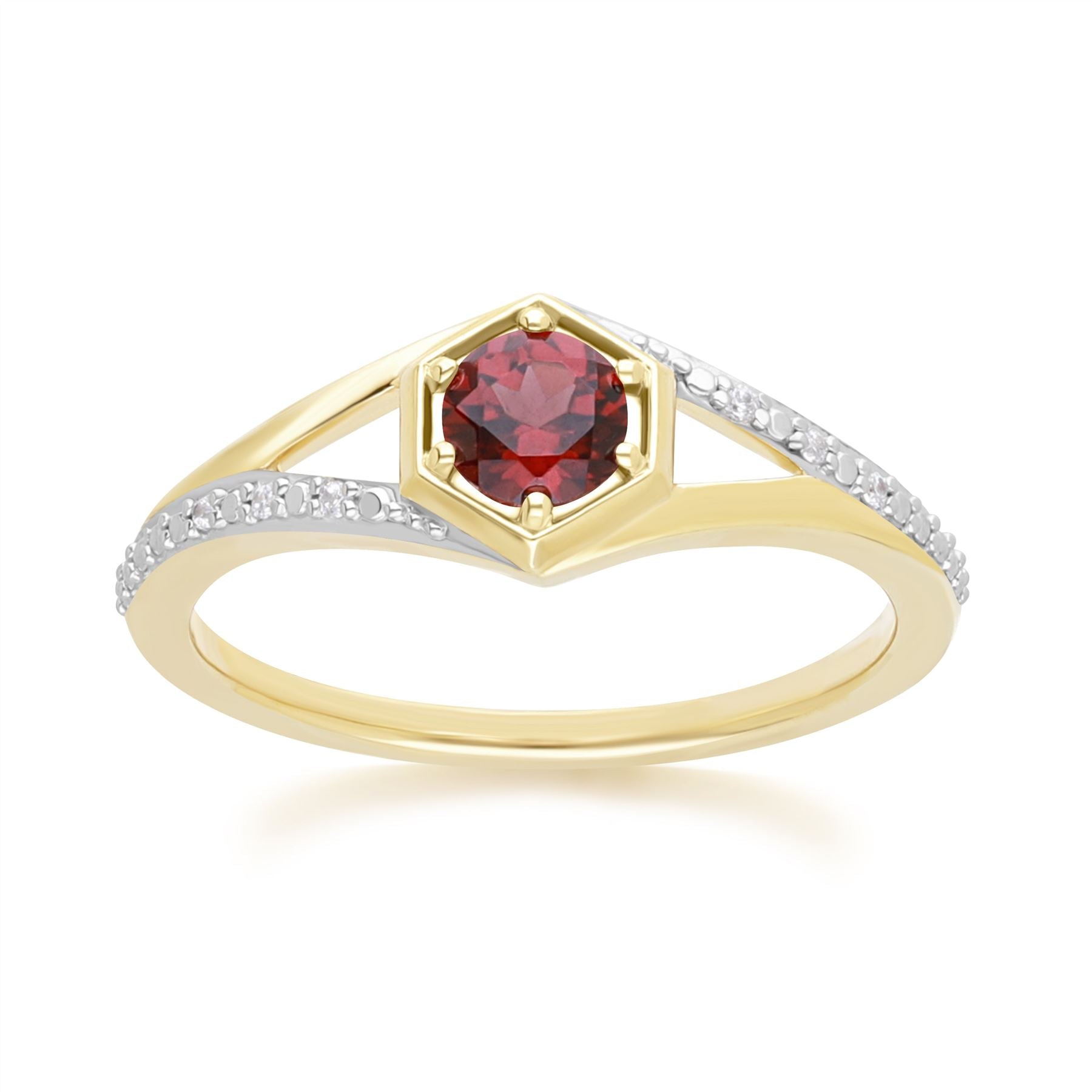 Geometric Hexagon with Prong set Round Garnet and Diamond Ring in 9ct Yellow Gold