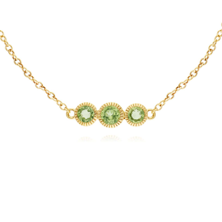 Three gradient round cut peridots, centrally set in a Milgrain decorated bezel, set on a brilliant 9ct yellow chain. Bracelet measures 19cm in length and secures with a bolt ring clasp.