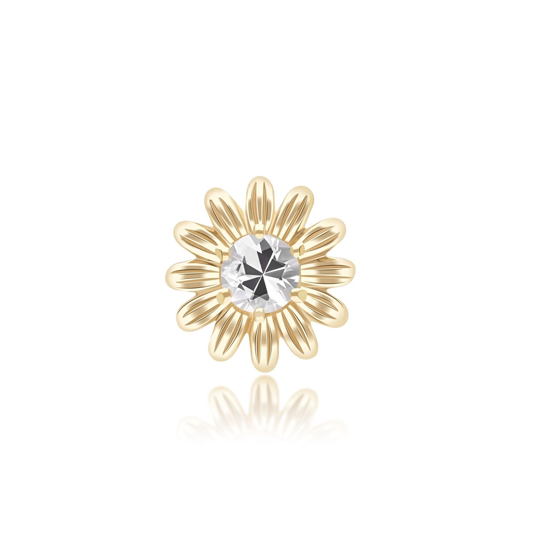 Radiating floral elegance, this gardenia daisy pin features a round white sapphire set in 9ct yellow gold to create a timeless and refined fine jewellery design. The flower-inspired silhouette highlights the natural beauty and brilliance of the gemstone while maintaining a classic, graceful aesthetic. Crafted in solid 9ct yellow gold.