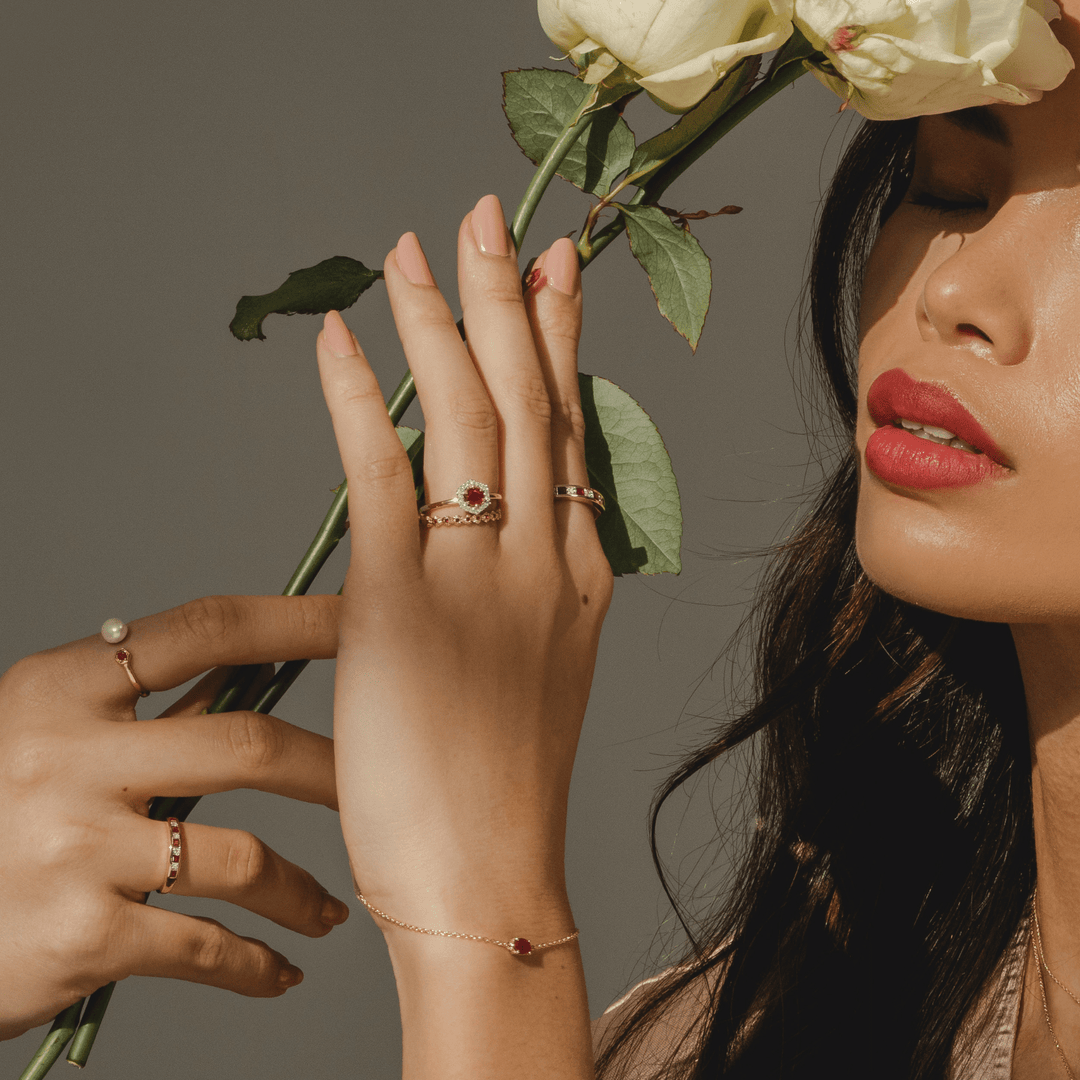 A lovely ruby and diamond eternity ring with alternating stones set on a 9ct yellow gold band. This ring is perfect for stacking to complement your favourite rings. Ruby is a stone of love and passion, making this the perfect gift for someone special.
